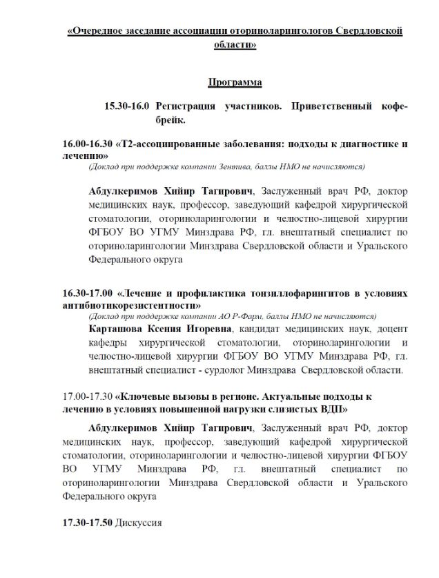 Очередное заседание ассоциации оториноларингологов Свердловской области Дата проведения: 19 сентября 2024 г. Место проведения: г. Екатеринбург, ул. Энгельса, 7, Отель «Novotel Екатеринбург Центр» конференц-зал.