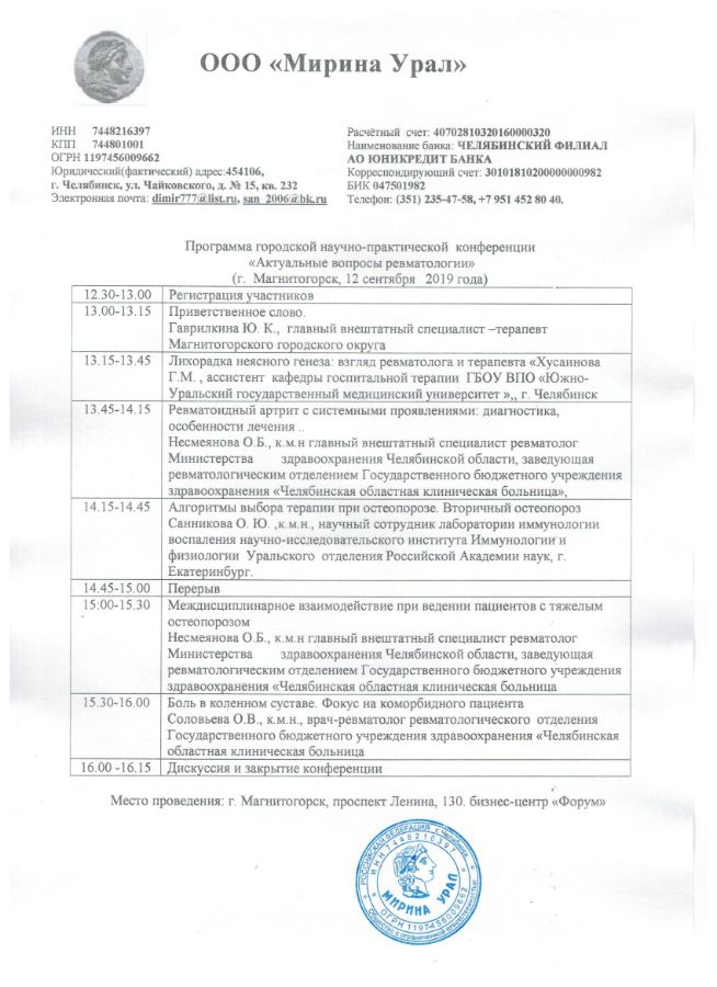 Программа городской научно-практической конференции «Актуальные вопросы ревматологии» (г. Магнитогорск, 12 сентября 2019 года)