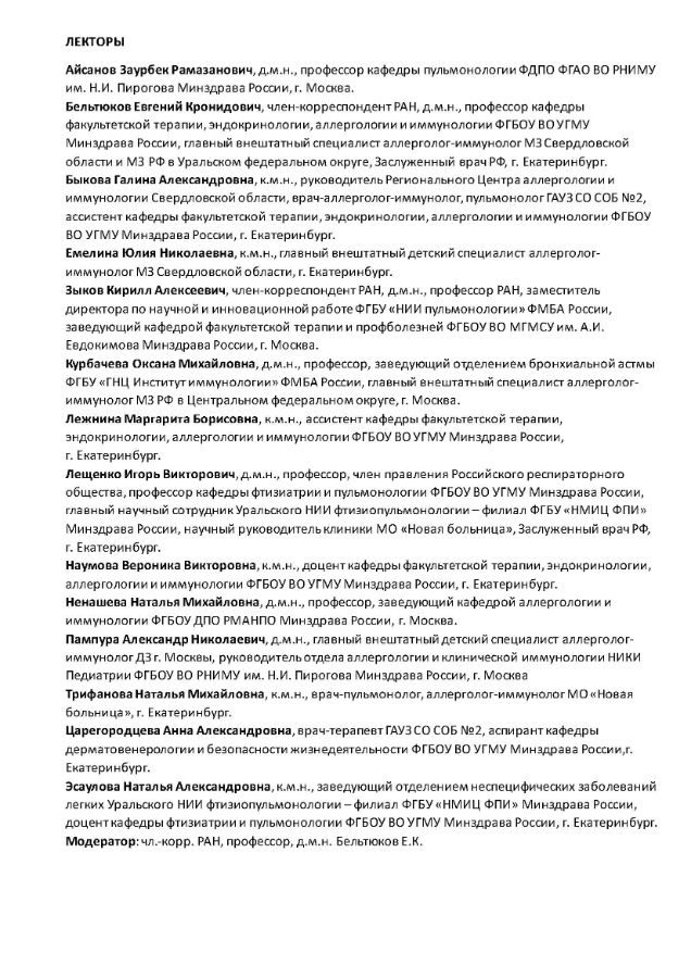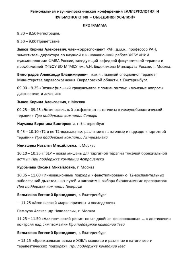 Региональная научно-практическая конференция «АЛЛЕРГОЛОГИЯ И ПУЛЬМОНОЛОГИЯ – ОБЪЕДИНЯЯ УСИЛИЯ!» Дата проведения: 19.04.2025 г. Место проведения: г. Екатеринбург, ул. Хохрякова, 1А отель "Tenet" конференц-зал.