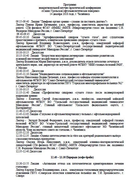 Межрегиональная научно-практическая конференция «Южно-Уральская офтальмологическая панорама» Место проведения: Гостиничный комплекс Парк отель «Березка», город Челябинск, ул. Чапаева, 118. Дата проведения: 14 декабря 2018 года