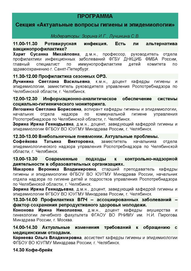 Секция «Актуальные вопросы гигиены и эпидемиологии» в рамках Всероссийского конгресса с международным участием «Фундаментальные и клинические исследования в персонализированной медицине», посвященный 80-летию ЮУГМУ |