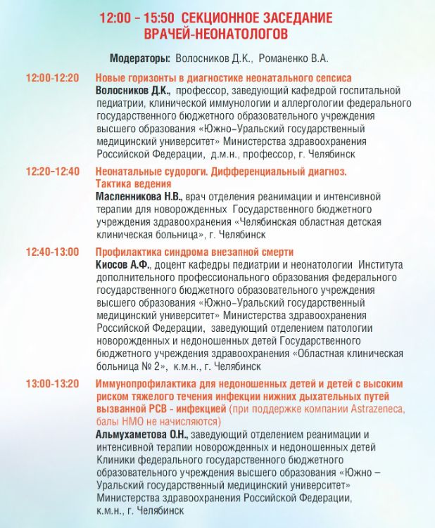 Секция «Актуальные вопросы неонатологии, неонатальной реанимации» в рамках 8-го Южно-уральского конгресса врачей акушеров-гинекологов, неонатологов, анестезиологов-реаниматологов, ультразвуковой пренатальной диагностики. |