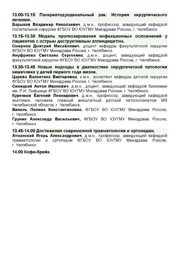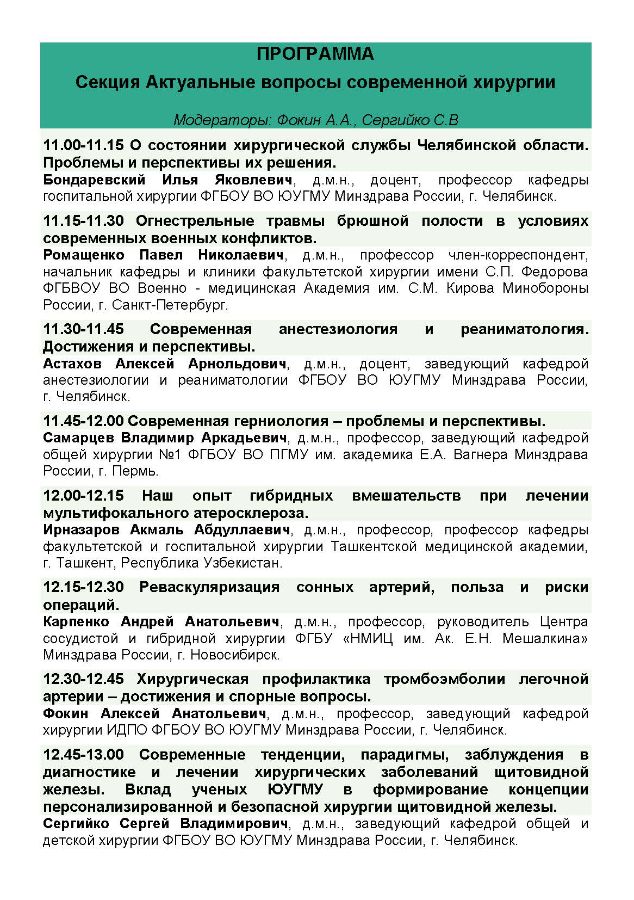 Секция "Актуальные вопросы современной хирургии" в рамках Всероссийского конгресса с международным участием «Фундаментальные и клинические исследования в персонализированной медицине», посвященный 80-летию ЮУГМУ |