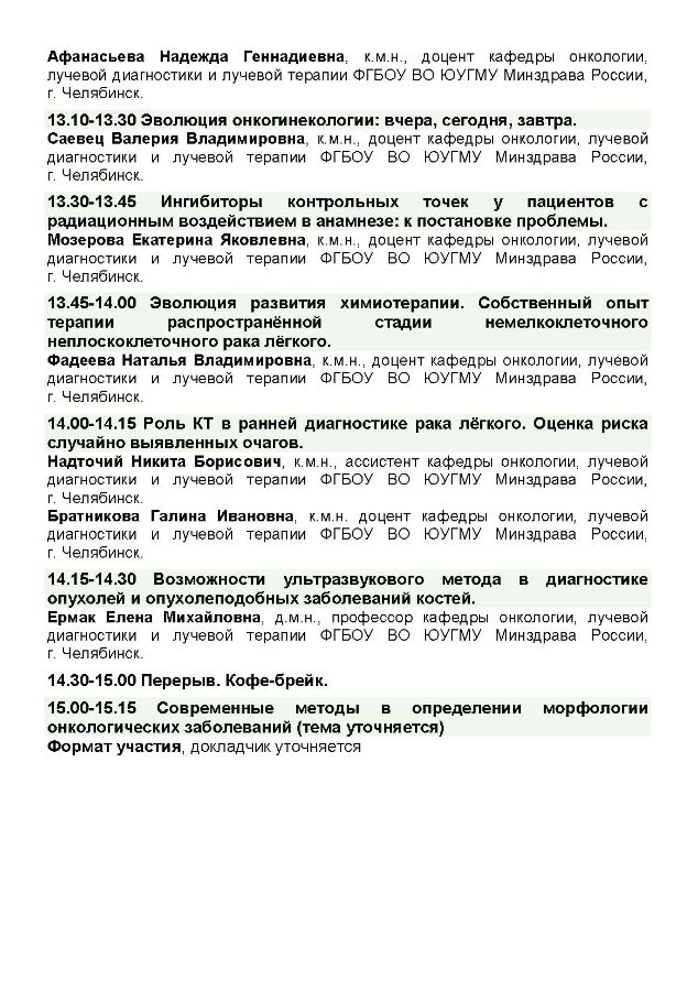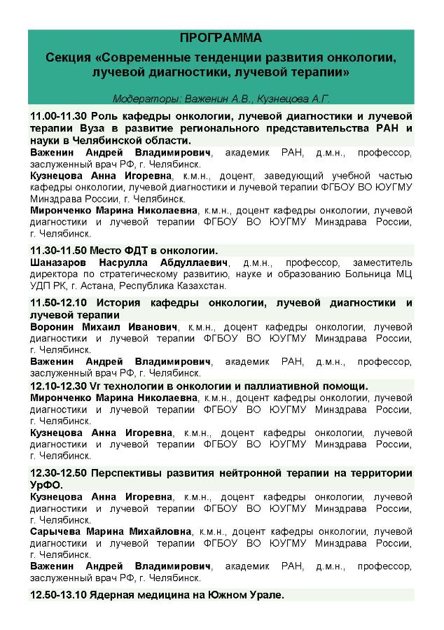 Секция «Современные тенденции развития онкологии, лучевой диагностики, лучевой терапии» в рамках Всероссийского конгресса с международным участием «Фундаментальные и клинические исследования в персонализированной медицине», посвященный 80-летию ЮУГМУ |
