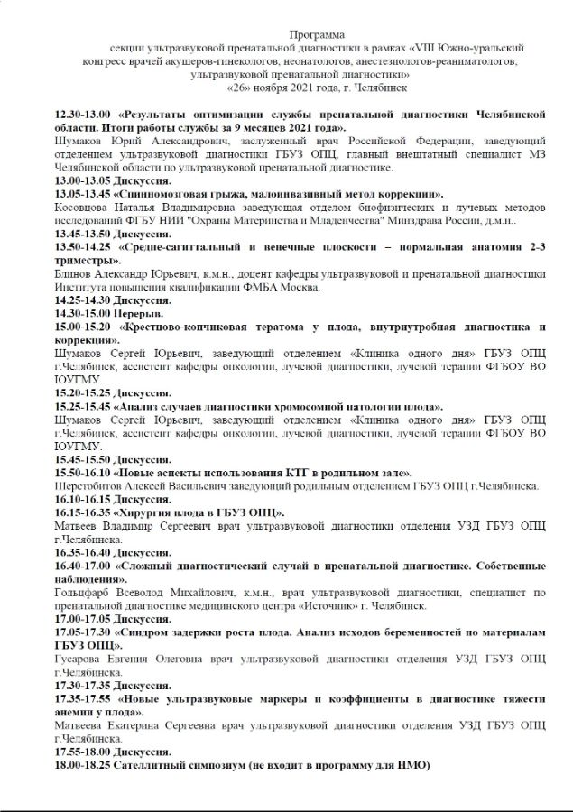 Секция ультразвуковой пренатальной диагностики в рамках «VIII Южно-уральский конгресс врачей акушеров-гинекологов, нео-натологов, анестезиологов-реаниматологов, ультразвуковой пренатальной диагностики» |