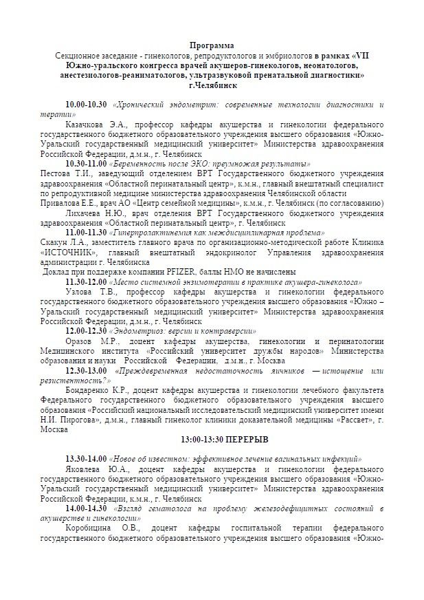Секционное заседание - гинекологов, репродуктологов и эмбриологов в рамках «VII Южно-уральского конгресса врачей акушеров-гинекологов, неонатологов, анестезиологов-реаниматологов, ультразвуковой пренатальной диагностики» |