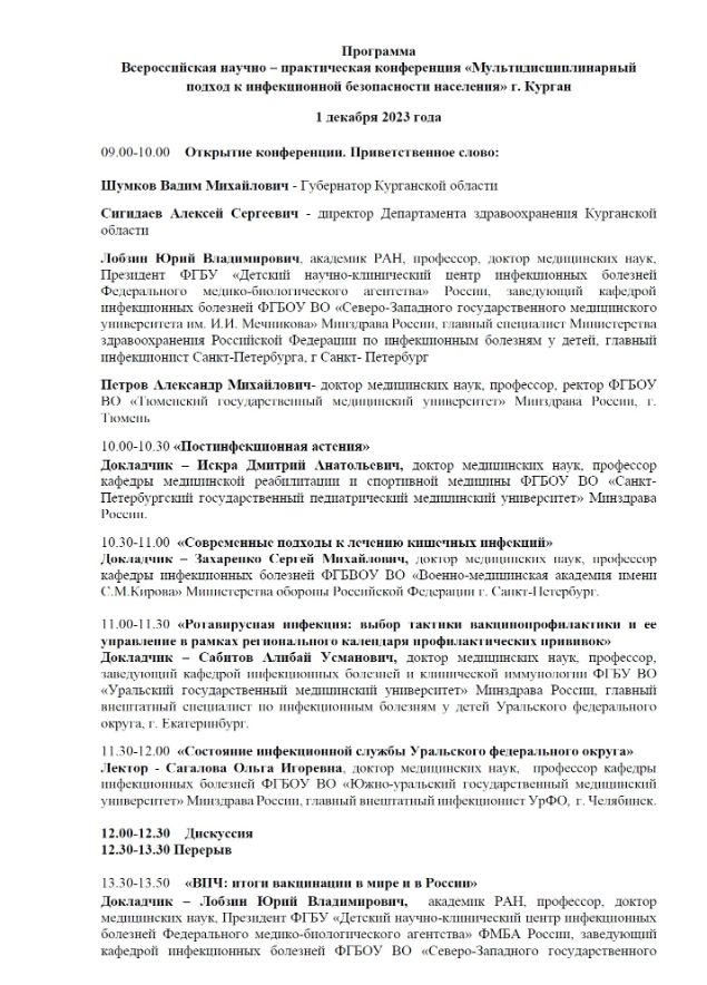 Всероссийская научно – практическая конференция «Мультидисциплинарный подход к инфекционной безопасности населения» Дата проведения: 1 декабря 2023 года. Место проведения: г. Курган, Троицкая пл., 1, Курганская филармония